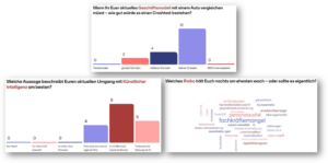Als Start in den Anlass wollten wir von allen Gästen ihre Meinung pro Schwerpunkt-Thema einholen. Dabei setzten wir die Applikation „Mentimeter“ ein, wo alle Gäste sich aktiv zu einzelnen Fragestellungen via Smartphone einbringen konnten.